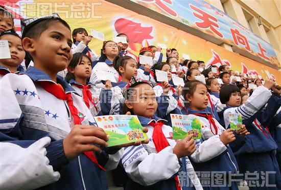 2009年10月12日,自治区团委在乌鲁木齐市第39小学举办纪念中国少年先锋队成立60周年暨全区中小学生互赠“民族团结连心卡”活动启动仪式。该活动启动后,全区中小学生将在“连心卡”上以文字、图画的形式传递祝福、鼓舞等信息,表达对民族团结的珍视。图为各族同学在展示“民族团结连心卡”。