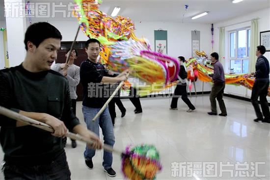 2010年2月5日,阿勒泰地区福海县福海镇由社区干部和社区居民组成的舞龙队正在排练,春节前后,该县将开展社火表演,文艺演出等一系列的活动,让广大城乡居民渡过一个欢乐、祥和、热闹的新年。