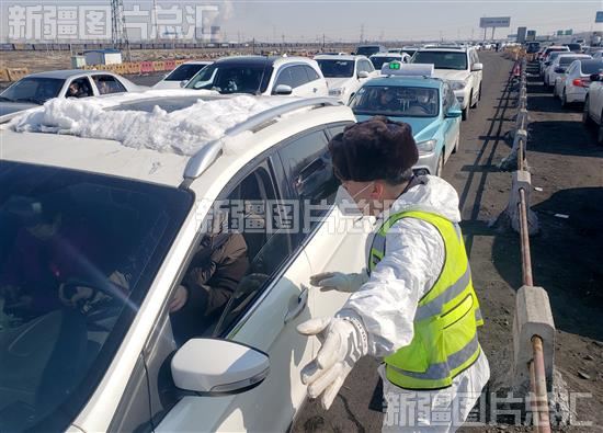 2020年3月10日,自治区公安厅交警总队高等级公路支队阜康大队民警在乌鲁木齐市公安局米东区分局甘泉堡公安检查站疏导车辆。面对返程车流高峰,自治区公安厅联合相关部门,增加车道、增派人员、增设检测点,多措并举保畅通。