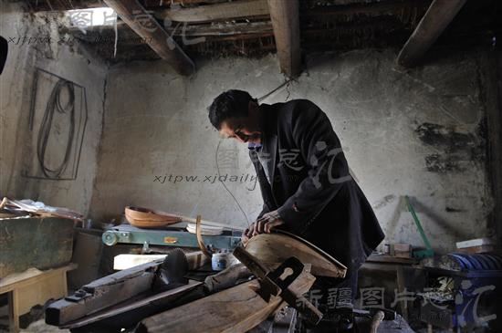 克勒迭能村,一名手工艺人在制作冬不拉乐器(摄于2014年3月12日)。