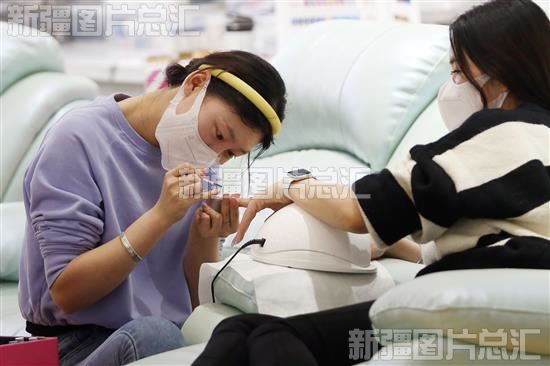 2022年12月8日,乌鲁木齐市德汇万达广场,工作人员在为顾客美甲。