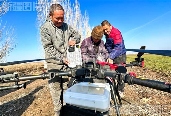 2023年3月15日,在呼图壁县二十里店镇宁州户村五队的冬小麦田地里,技术人员调试植保无人机。