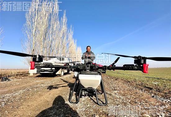 2023年3月15日,在呼图壁县二十里店镇宁州户村五队的冬小麦田地里,技术人员调试植保无人机。