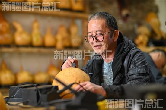 2023年4月12日,游客在呼图壁县五工台镇幸福村的乡村葫芦园体验葫芦烫刻创作。