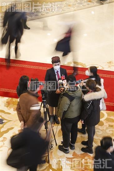 2023年1月14日,参加新疆维吾尔自治区第十四届人民代表大会第一次会的人大代表,被记者包围,接受采访。