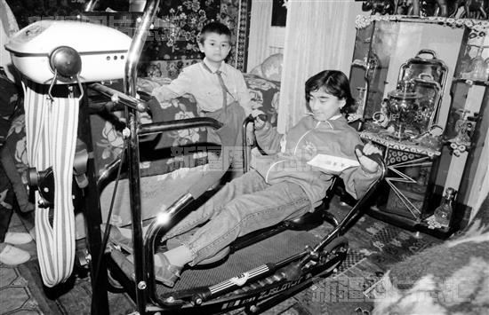 1995年9月5日,乌鲁木齐市,小朋友在用自家多功能健身器锻炼。
